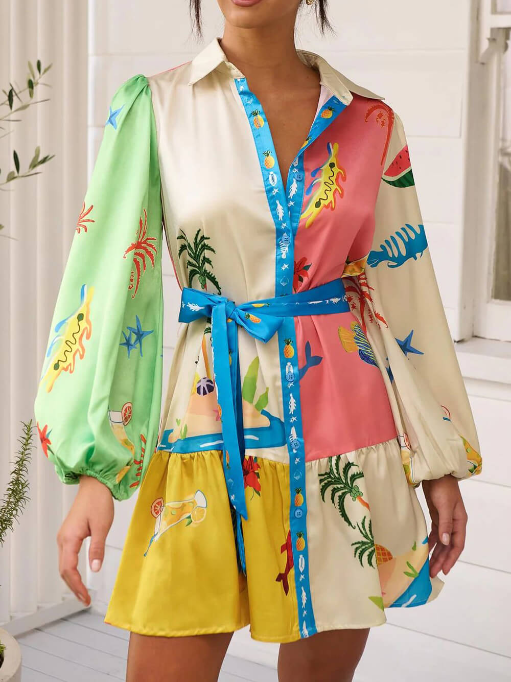 Graffiti Print Lace-Up Cardigan Loose Short Dress With Wide Hem