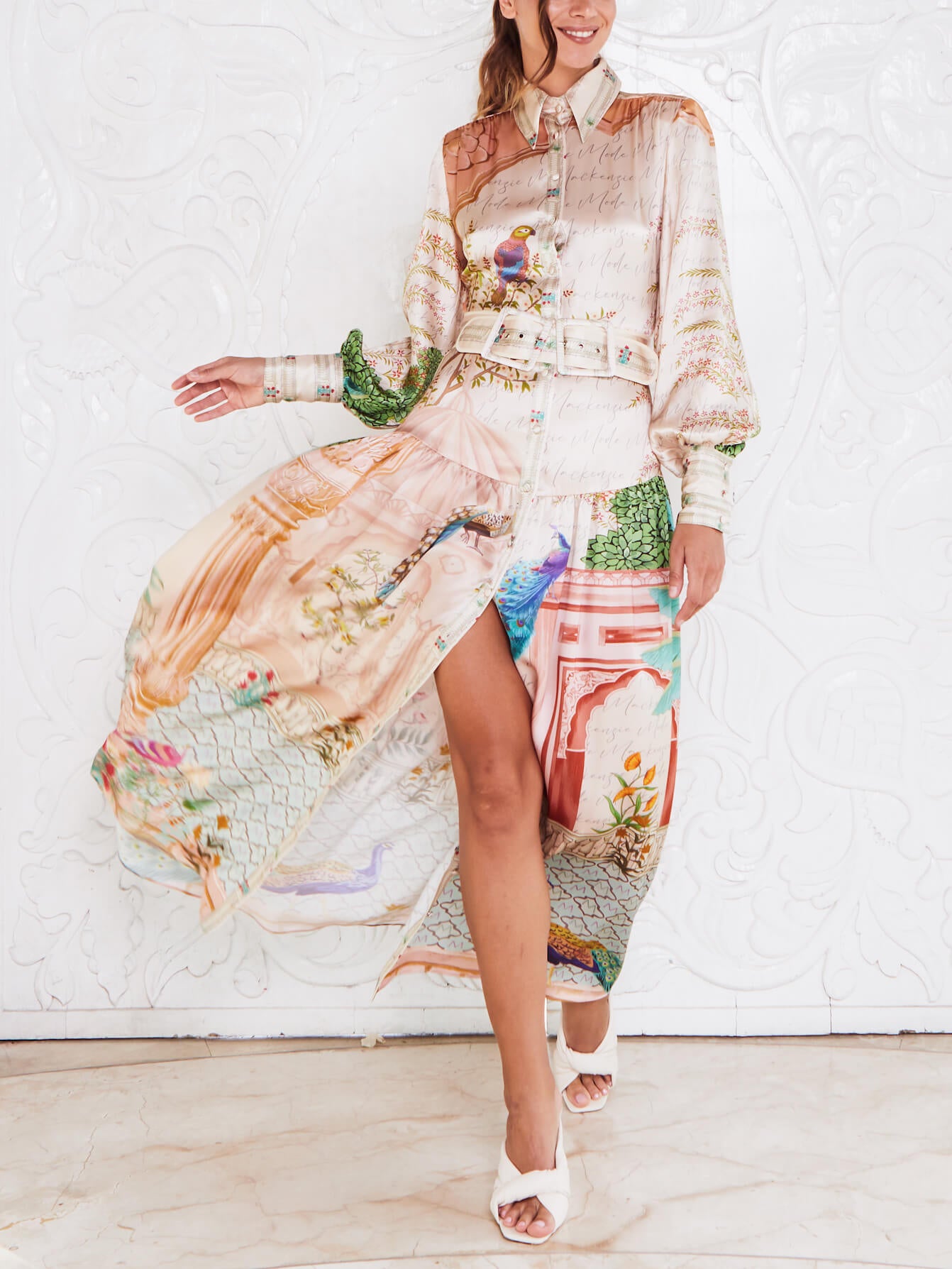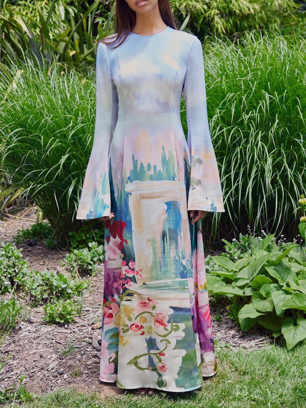 Exquisite Satin Graffiti Print Trumpet Sleeve Maxi Dress