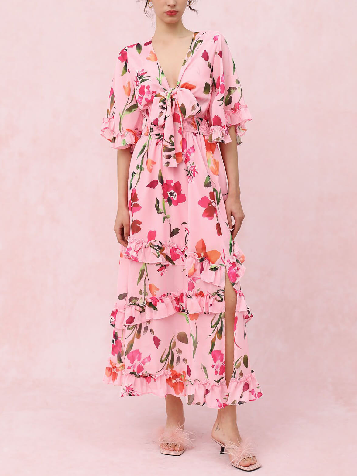 Summer Sweet Holiday Floral Tie Front V Neck Midi Dress
