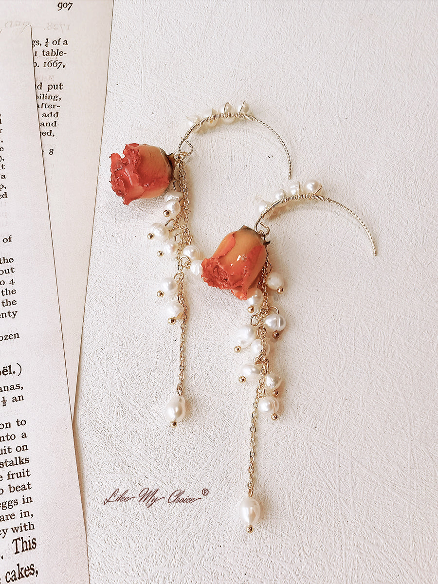 Pressed Flower Earrings - Pearl Dried Rose Flower