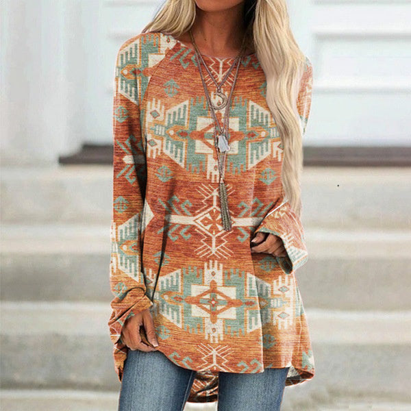 Vintage Western Print Long Sleeve Casual Tunic