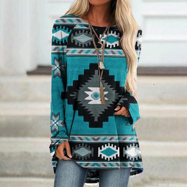 Vintage Western Print Crew Neck Long Sleeve Tunic