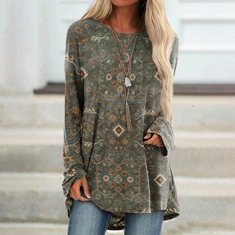 Vintage Print Crew Neck Long Sleeve Tunic