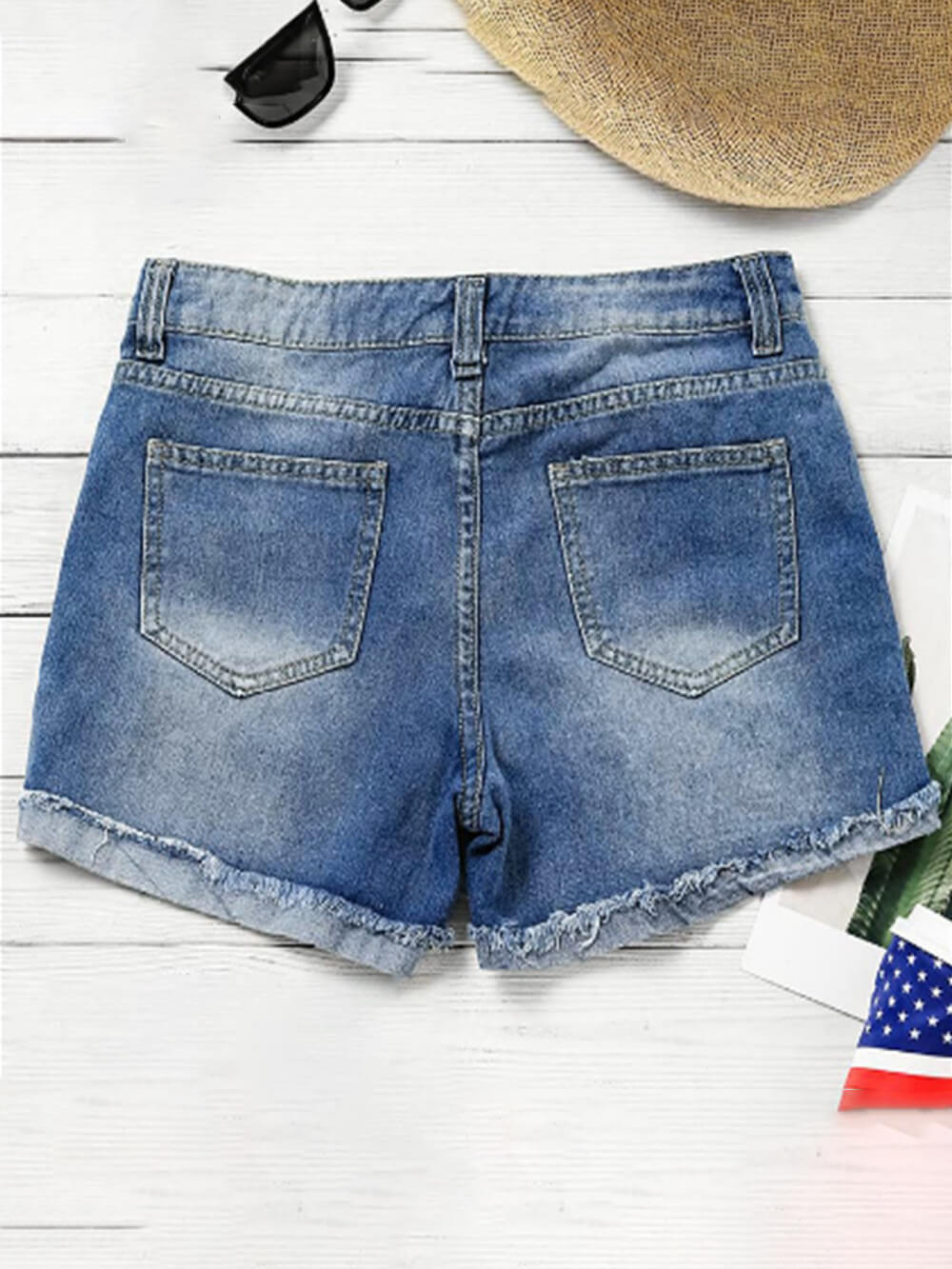 These flag-cuffed ripped straight-leg denim shorts are designed with denim and an American flag, and have frayed holes at the bottom, creating a vibrant and classy look and adding a touch of romance.