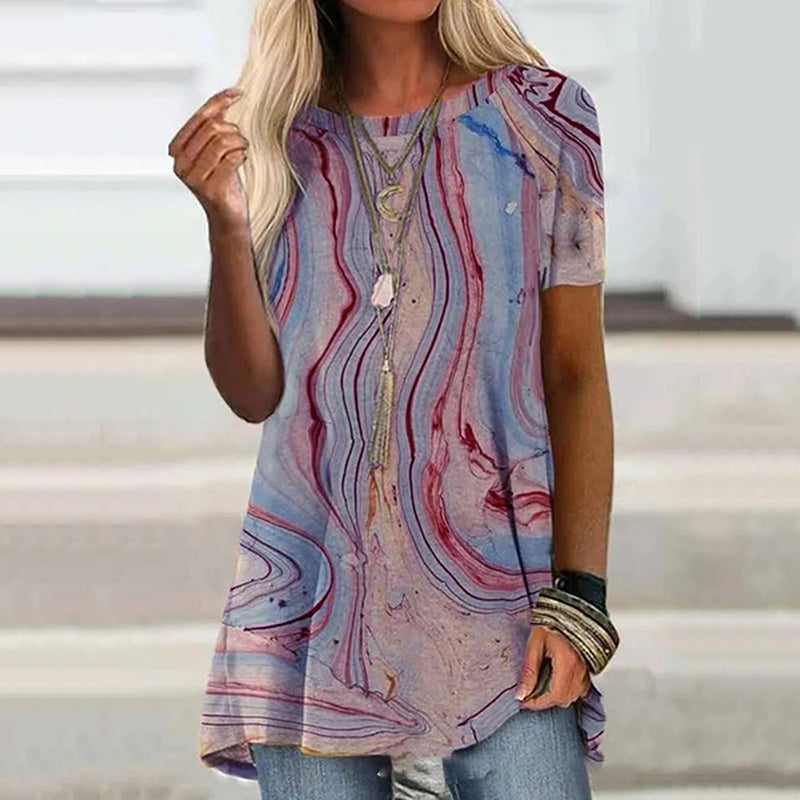 Wisherryy Loose Print Crew Neck Short Sleeve Tunic Top