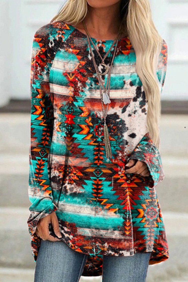 Vintage Western Print Crew Neck Long Sleeve Tunic